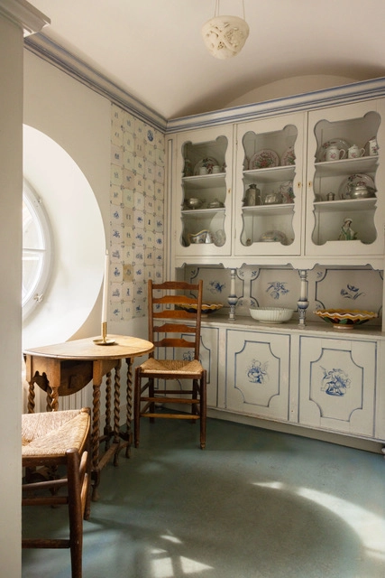 I det lilla frukostrummet åt paret Milles frukost vid ett litet ekbord omgivna av blåvita Delftkakelväggar. Olga Milles målade vitrinskåpet i samma färger och med dekor lånad från det nederländska 1700-talskaklet. I vitrinen förvaras familjens fina samling av svenskt glas, tenn och keramik. Här finns bl.a formgivare som Simon Gate och Edward Hald representerade.
